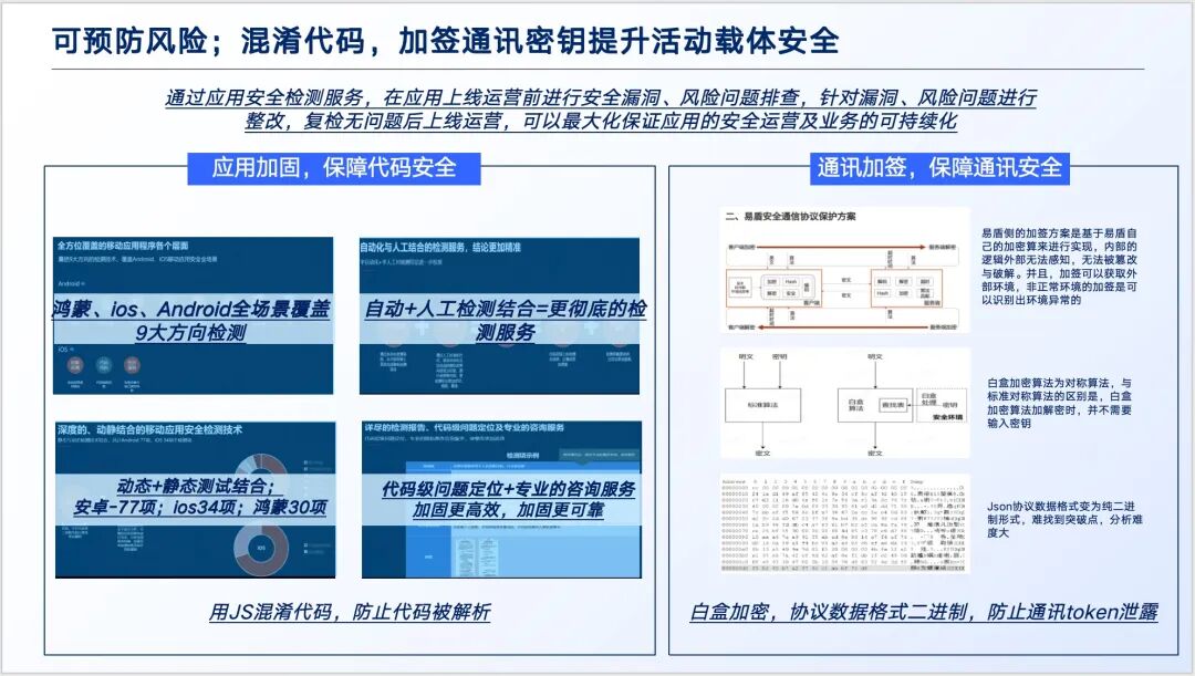 值得一提的是,易盾还提供终端安全能力,包括加固防篡改、通讯加签、SDK 环境识别、白盒加密等,为 App 和小程序的活动承载页建立更强的安全底座,使黑产难以通过逆向、抓包、脚本注入等方式绕过前端参与活动。