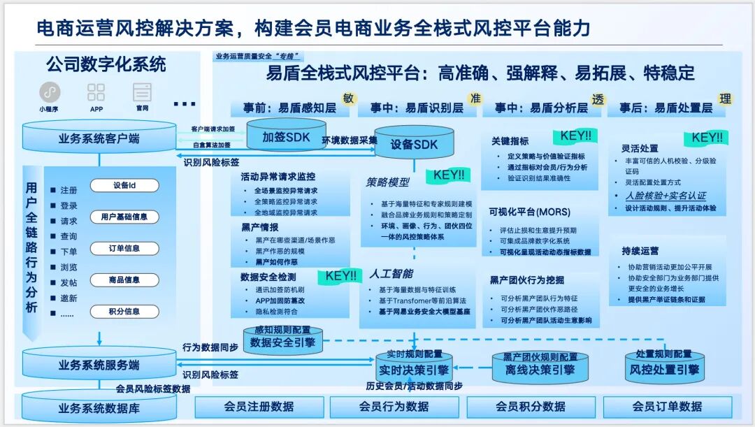 面对双十一期间不断升级的黑产链路与业务复杂性,电商平台需要的不只是“安全产品”,而是一套能与业务共同演化的系统能力。易盾凭借多年在内容安全与业务风控领域的技术积累,提供面向电商行业的全链路智能风控体系,通过“事前预防—事中检测—事后回溯”的闭环机制,并以感知、识别、分析、处置四层能力为支撑,帮助企业在高并发、高复杂度的业务环境中实现安全与增长的平衡。