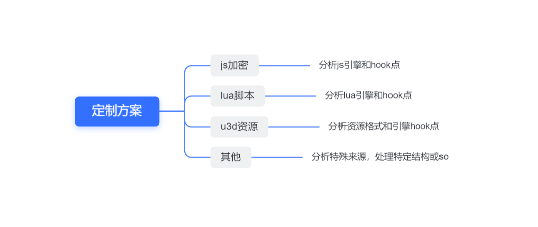 定制方案的使用场景多样,一般根据文件类型分类,包括脚本类和资源类。其中,js,lua,python等脚本,根据不同的脚本引擎做加密,同时利用hook或重写解释器的方式重新解析脚本进行解密,而u3d资源,png,jpg图片等资源,可能会涉及资源读取方式或基于图片格式制定的加密方式,加密后需在特定时机进行解密。