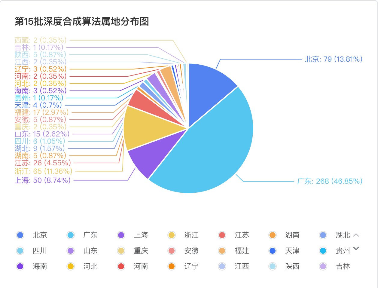 本次备案呈现显著的 “区域集中、多点扩散” 特征,广东(268)、北京(79)、浙江(65)、上海(50)凭借产业基础与政策优势,成为算法备案核心聚集区,四省(市)合计备案数量达 462 款,占总备案量的 80.77%,广东自第14批之后,超越北京,领跑全国。具体分布如下: