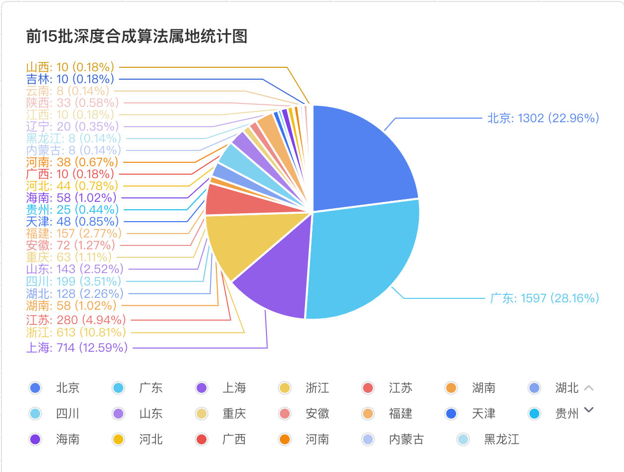 前15批深度合成算法,广东省一枝独秀以1597款备案,超越北京,领跑全国,占比28.16%;北京市以1302款产品,占比22.96%,紧随其后;上海714款,占比12.59%位居第三;浙江613款,占比10.81%,位居第四;江苏以280款产品,占比4.94%位居第五。前五各地区合计占比79.46%,可见,科技企业其中在广、北、上、浙及苏发达地区,其他地区共计占比20%左右。